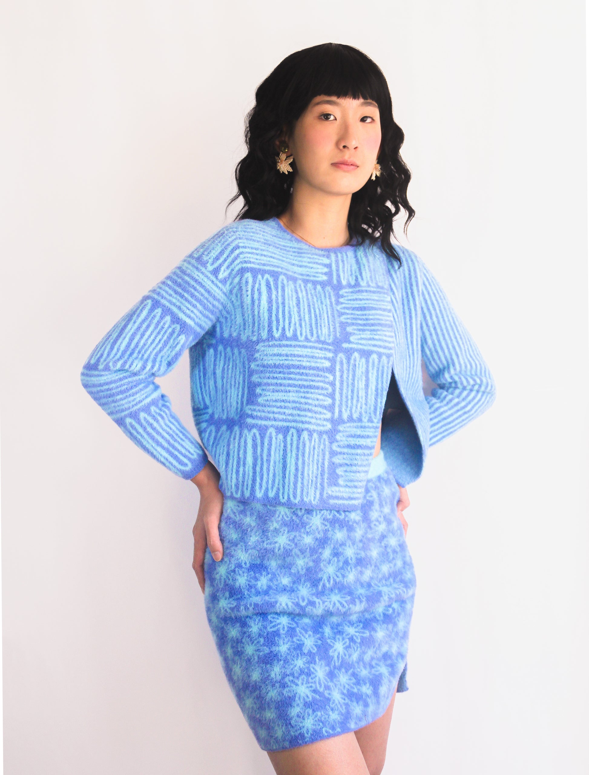 This mohair split top is a work of wearable art, featuring intricate line-drawing patterns that create a striking visual texture. Made from a soft, luxurious mohair blend, it offers a lightweight yet cozy feel, perfect for wearing with the mohair top from the same DOVINS collection or matching with other top pieces.