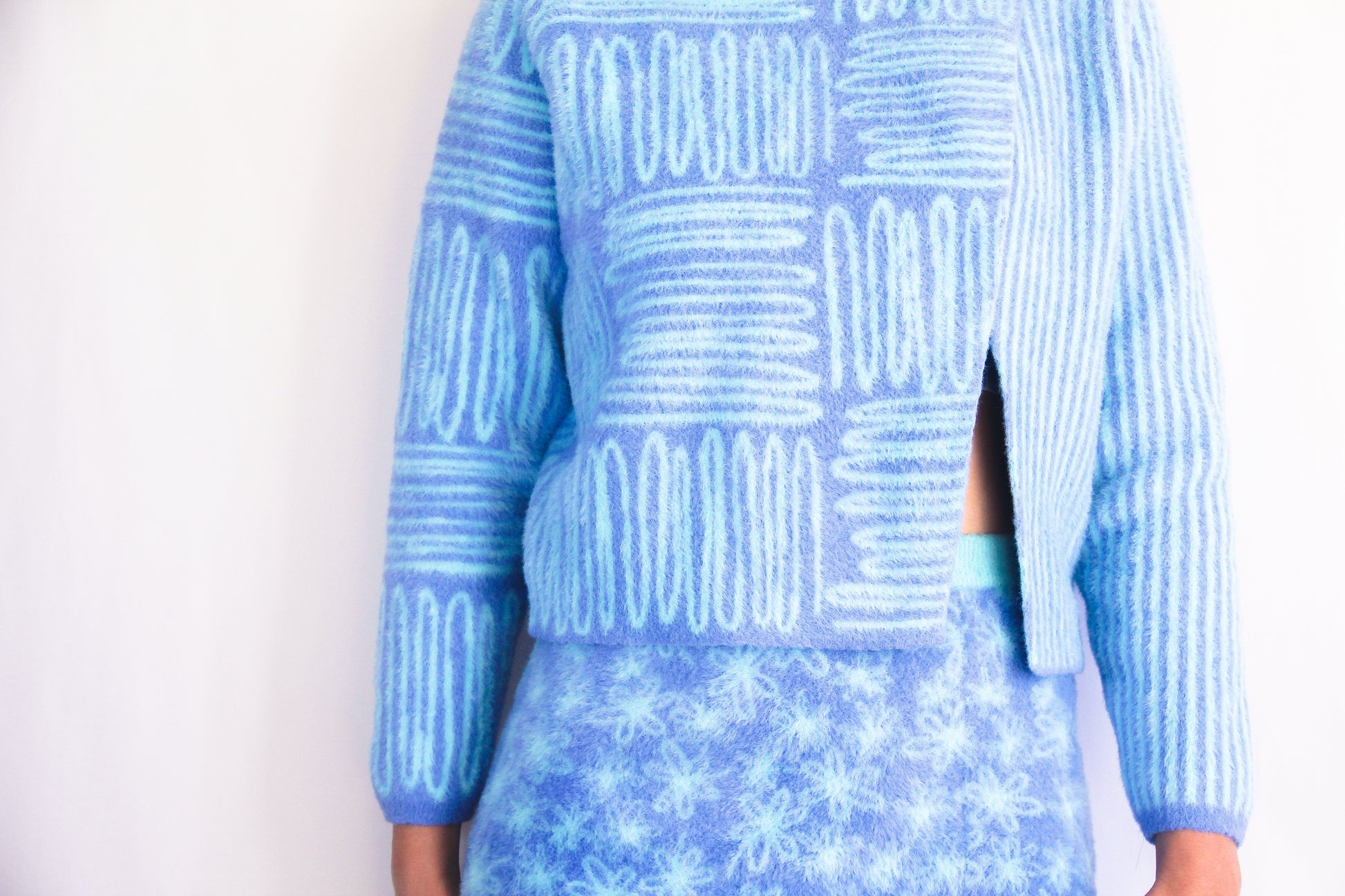 This mohair split top is a work of wearable art, featuring intricate line-drawing patterns that create a striking visual texture. Made from a soft, luxurious nylon mohair, it offers a lightweight yet cozy feel, perfect for layering or wearing on its own. The split design adds a contemporary edge, allowing for effortless movement and a relaxed silhouette. With its unique artistry and modern detailing, this top is a statement piece that seamlessly combines comfort with creative style.