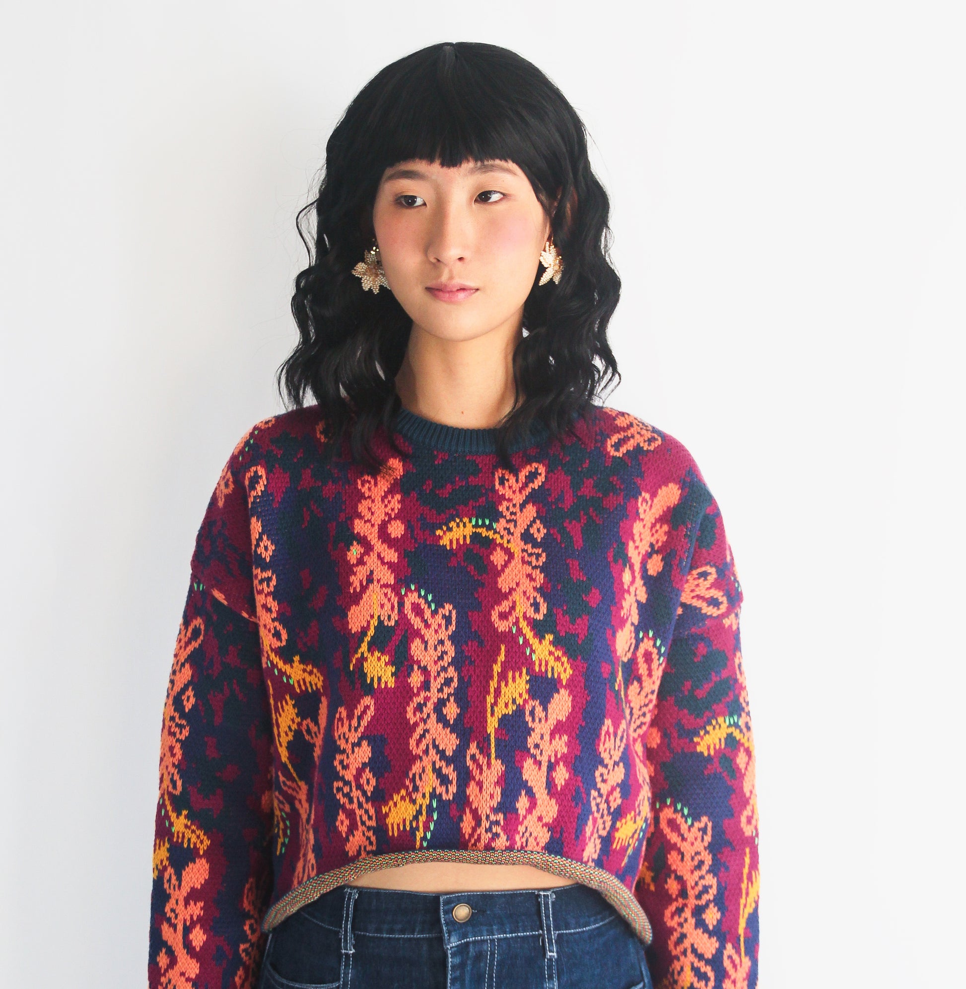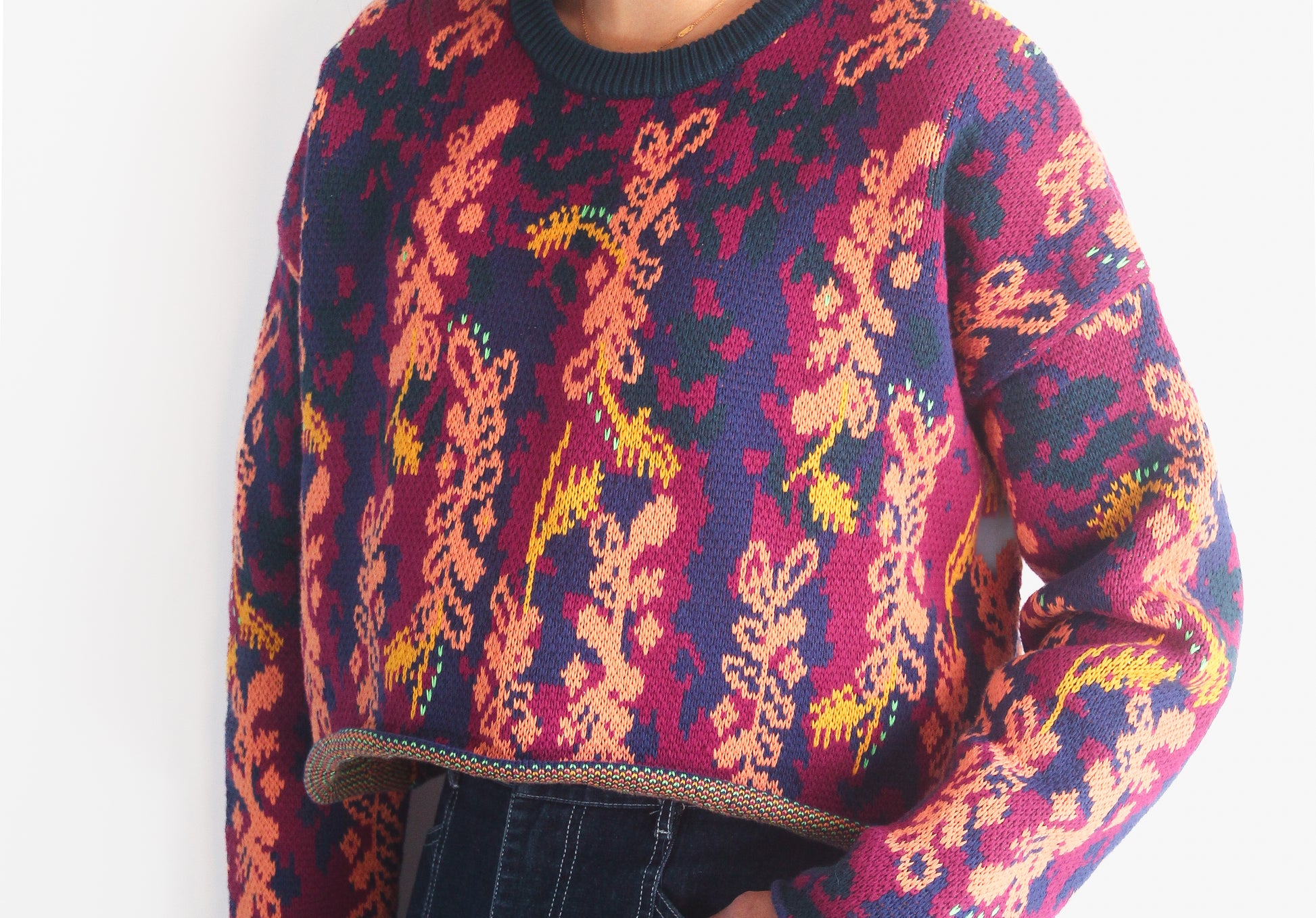 This elegant cotton sweater blends sophistication with vibrant charm. Dominated by a rich, regal burgundy, it’s accented with subtle pops of colorful detailing that add depth and visual interest without overpowering its refined aesthetic. Crafted from premium, breathable cotton, the sweater offers a soft, luxurious feel and exceptional comfort. It’s perfect for elevating casual looks or complementing chic, tailored outfits.